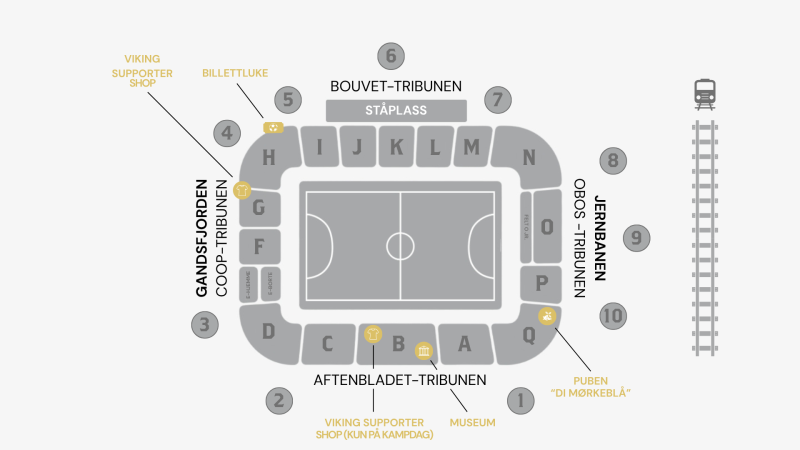 - De fra feltene F-N må fortsatt gjennom hovedinngang foran pub og få stempel som nevnt ovenfor. Har du allerede scannet deg inn på feltet ditt, skal du gå ut port 7 og få stempel når du går ut av stadion.